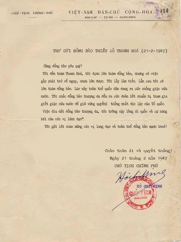 Thư gửi đồng bào thiểu số Thanh Hoá năm 1947 của Chủ tịch Hồ Chí Minh